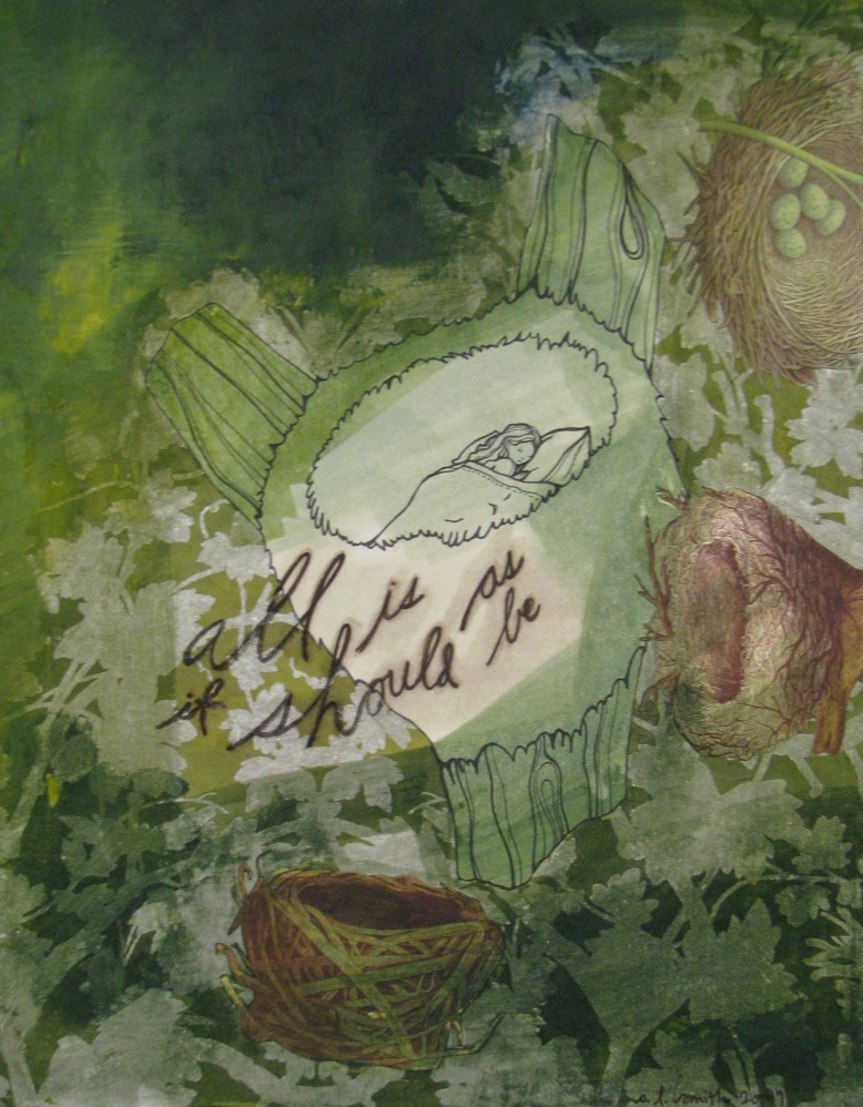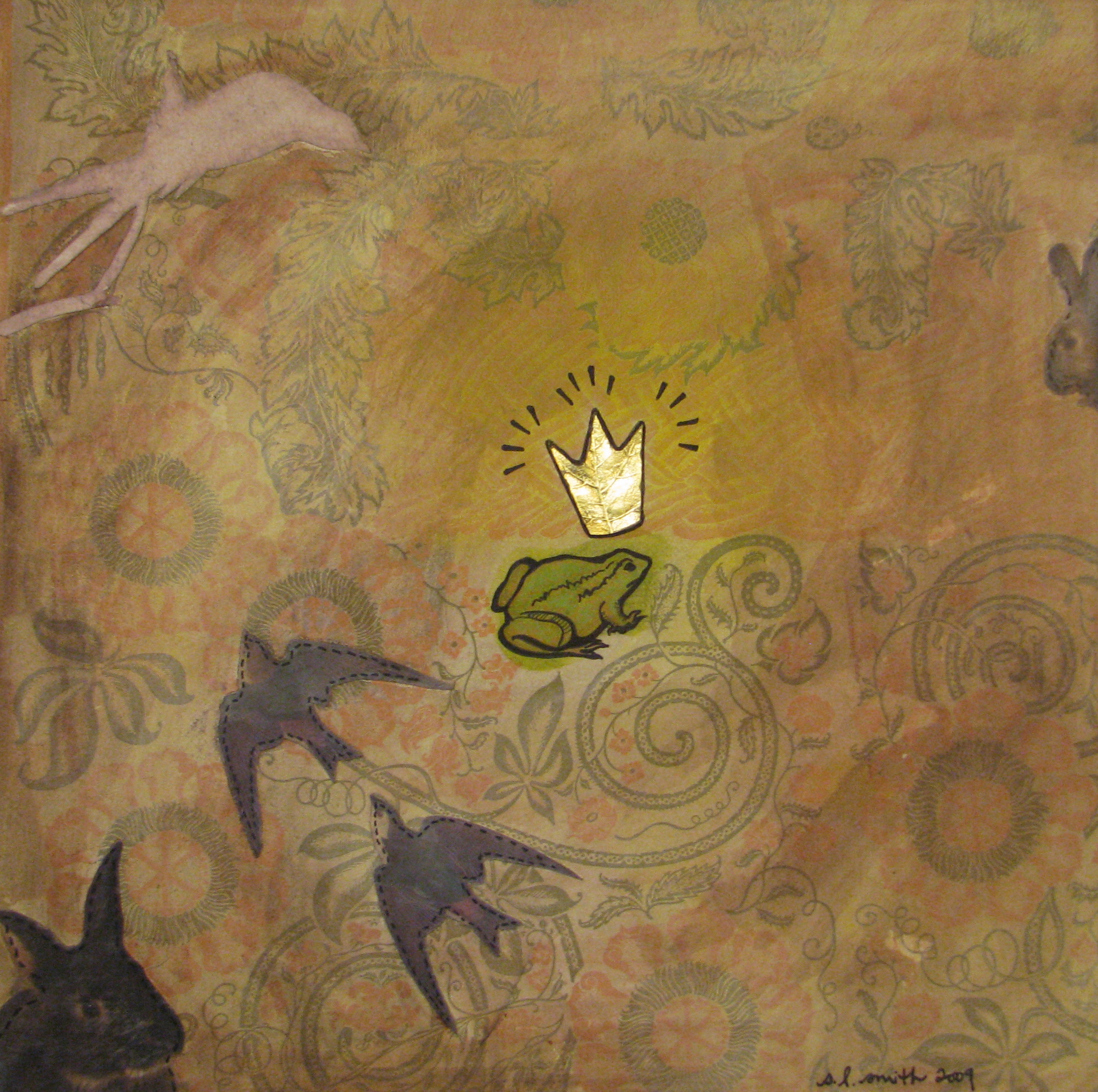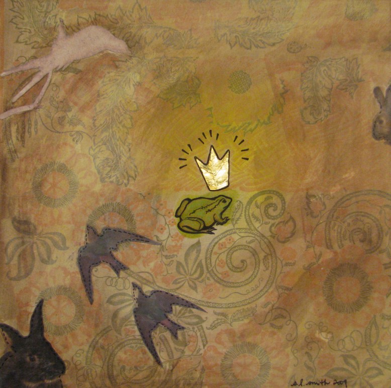 new stories, another show: may 7 March 25, 2010June 3, 2013 night-mare 2009 collage materials on canvas 12 x 12in. SOLD all is as it should be 2009 collage materials, lokta on canvas 11 x 14in. $230 gotta kiss a lot of frogs 2009 collage materials, italian paper on canvas 12 x 12in. SOLD Share this: Share on Facebook (Opens in new window) Facebook Share on X (Opens in new window) X Like Loading... Related