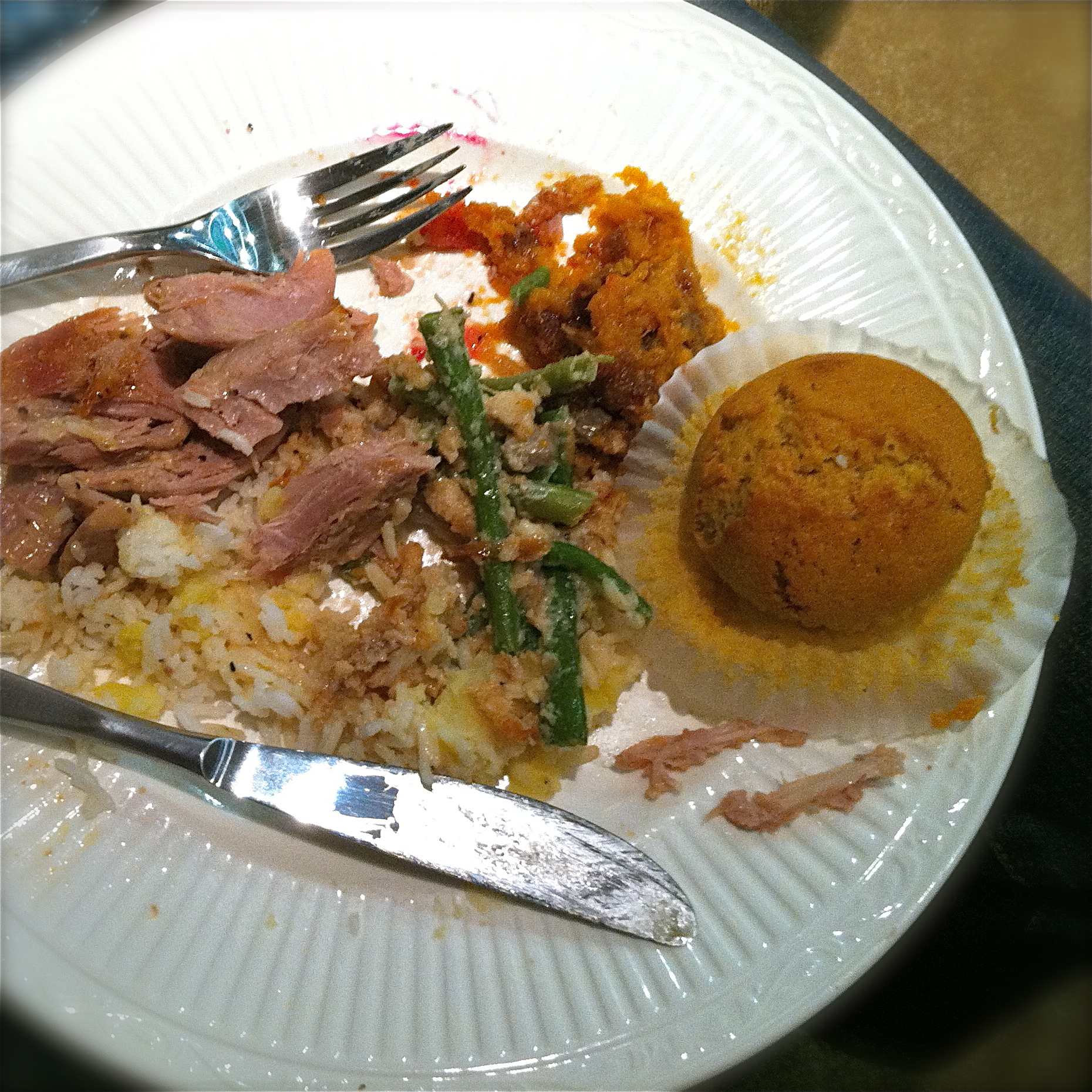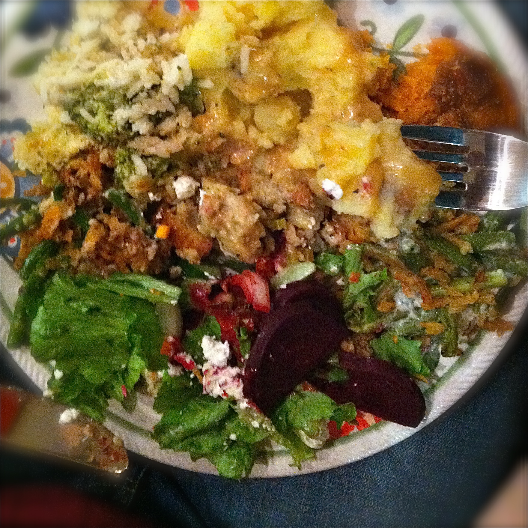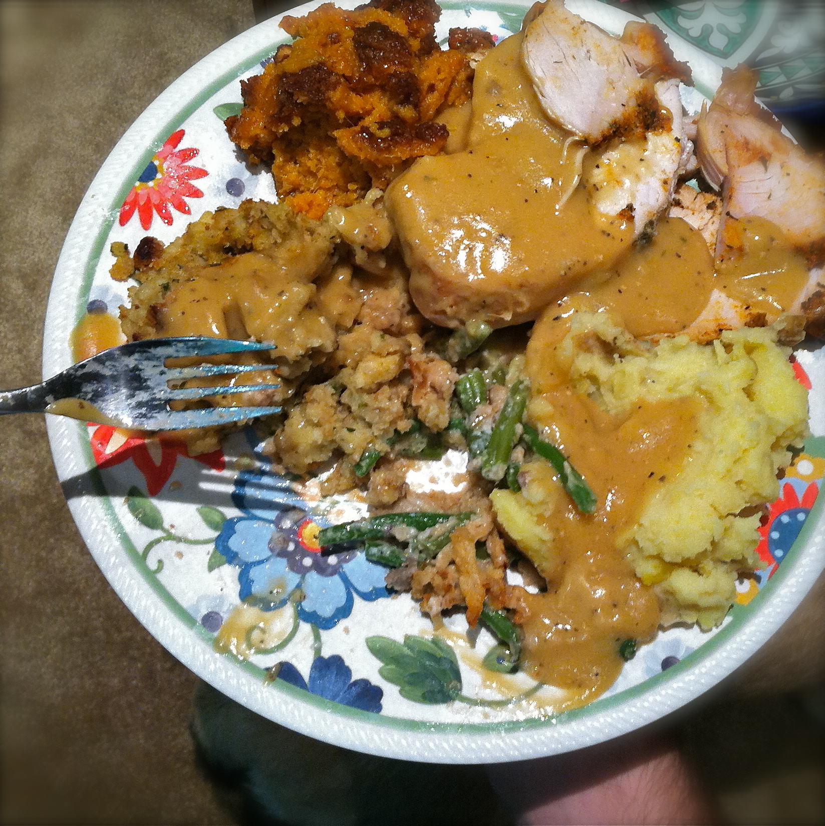 I believe that sweet potato casserole is the cornerstone of Thanksgiving. Thanks to sliced, canned tubers (and the diplomatic pouch), these featured prominently at our event.